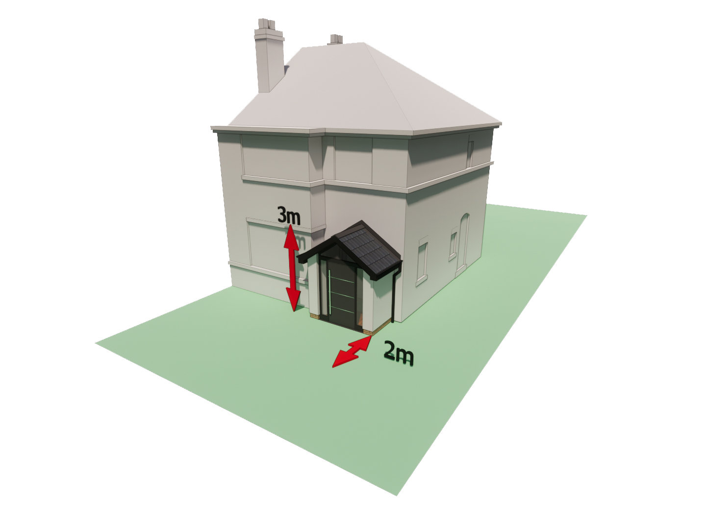- The height of the porch roof should not exceed 3 meters, regardless of whether it has a duo pitched, mono pitched, or flat design, and it should be at least 2 meters away from any public road or footpath.
